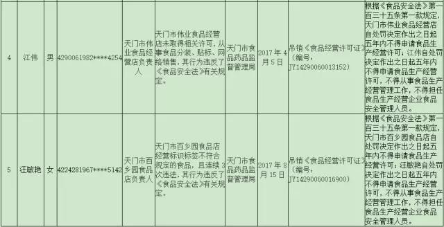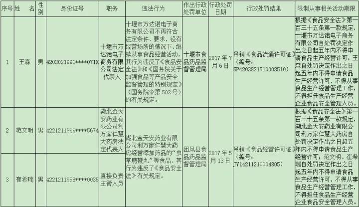 黑名单信息显示,截至11月30日,范文明、崔希瑞等5名被吊销食品生产经营许可证,并被处以5年内不得申请食品生产经营许可,不得从事食品生产经营管理工作,不得担任食品生产经营企业食品安全管理人员的惩罚;对唐国周、肖传强等32名因食品安全犯罪被判处有期徒刑以上刑罚人员依法作出终身禁入处罚。