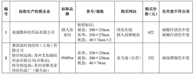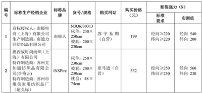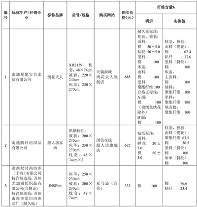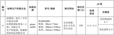 近日,北京市消费者协会官网发布床上用品比较试验结果。本次比较试验中,40个测试样品中30个样品所有测试项目均符合国家标准要求,占样品总数的75%,其中,内在质量符合国家标准的共有35种,占样品总数的87.5%;有8个样品使用说明(标识)不符合标准规定。比较试验结果表明:网购床上用品样品的产品质量较好,但仍存在一定问题,主要是使用说明标注不规范、纤维含量标注与实测不符、规格尺寸偏差率超标、pH值超标、断裂强力不达标,色牢度不符合。